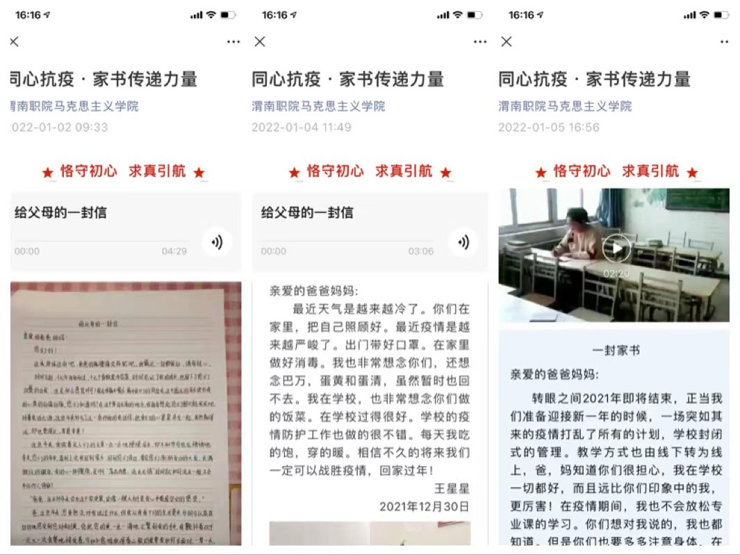 ---创新思政课教学模式,传递坚定力量。为鼓舞全校师生同心抗疫、共渡难关的信心,jdb电子游戏官方网站精心策划了“同心抗疫·家书传递力量”和“同心抗疫·思政微课堂”系列栏目。截至目前,共收到学生家书百余封,通过新媒体平台推送23封,学生在家书中向父母表达着思念与感恩之情。四位思政老师,结合课程内容和疫情防控工作实际,分别以“践行伟大抗疫精神”“如何调节不良情绪”“如何培养法律意识”“青年的责任与担当”等内容,深入公寓与学生面对面交流沟通,倾听学生心声、拉近师生距离、增进师生情谊,实现思政“小课堂”和社会“大课堂”同频共振,坚定师生战胜疫情的信心。同时,jdb电子游戏官方网站3名行政干部深入宿舍为学生庆生,送上暖心的生日祝福。