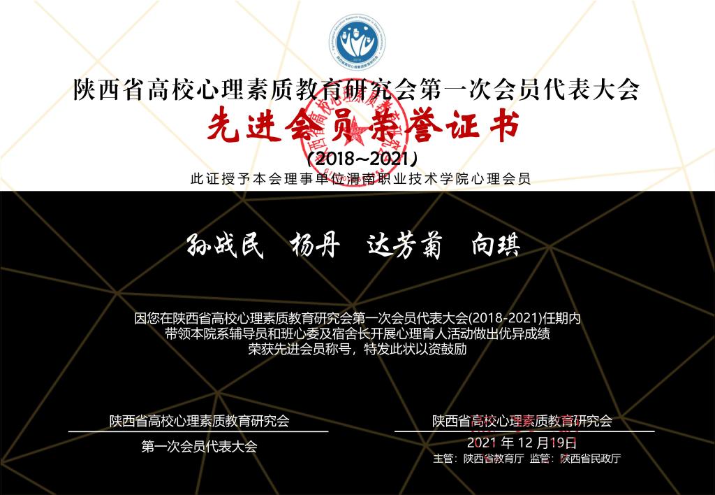 近日,省高校心理素质教育研究会对理事单位心理育人工作成就进行了表彰,jdb电子达芳菊教授、向琪副教授两位老师荣获“先进会员”荣誉称号。向琪老师还荣获“2021年度陕西省高校十佳心理师提名”荣誉称号。