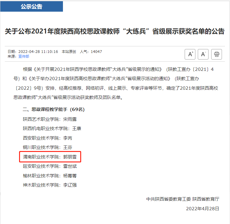 4月28日上午,陕西省委教育工委、省教育厅联合公布了《关于2021年陕西高校思政课教师‘大练兵’省级展示获奖名单的公告》,jdb电子jdb电子游戏官方网站青年骨干教师郭朋雪获思政课程教学能手荣誉称号。