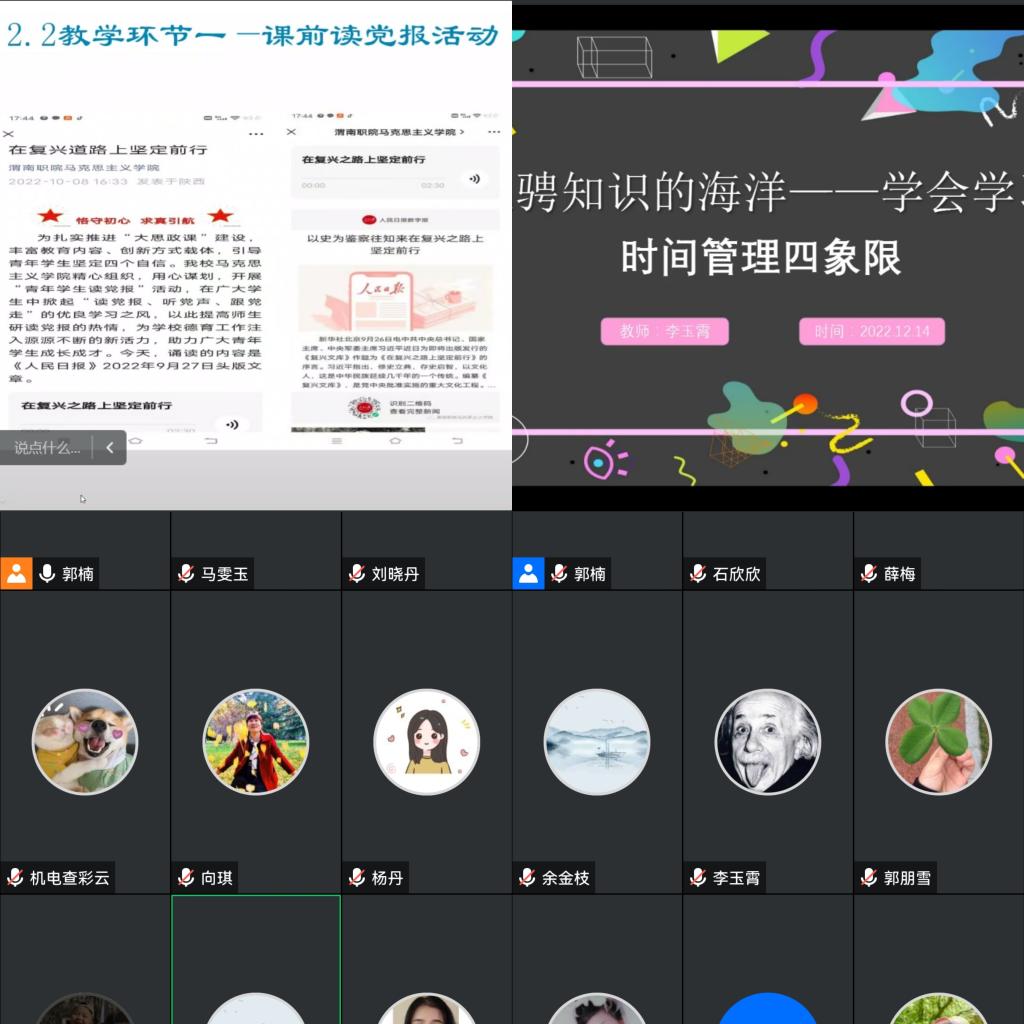 为提升思政课教学水平,12月15日下午,jdb电子游戏官方网站根据学校教学能力比赛要求线上开展教学能力比赛初赛,德法与心理教研室的2个参赛团队参加了本次比赛。院长史改侠、副院长王晓莉、副高以上职称教师达芳菊、韩秀阁、王爱、常俊侠6位老师担任评委,比赛由王晓莉主持,无课教师观摩了比赛。